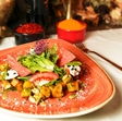 Листя салату, вершковий сир, свіжий помідор, кунжутне масло і солодкий чілі.